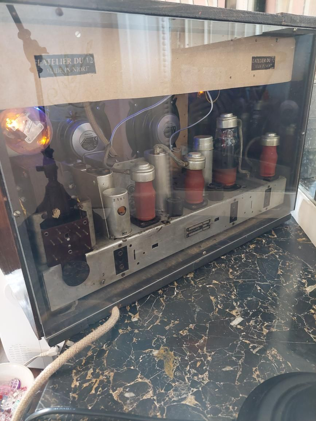 Poste vintage transformé, avec récepteur Bluetooth et ancien mécanisme apparent à l'arrière