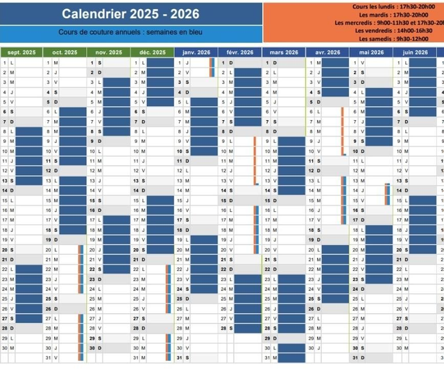 2 ateliers par mois de septembre à juin soit 20 ateliers couture. Thèmes libres ou proposés au choix.